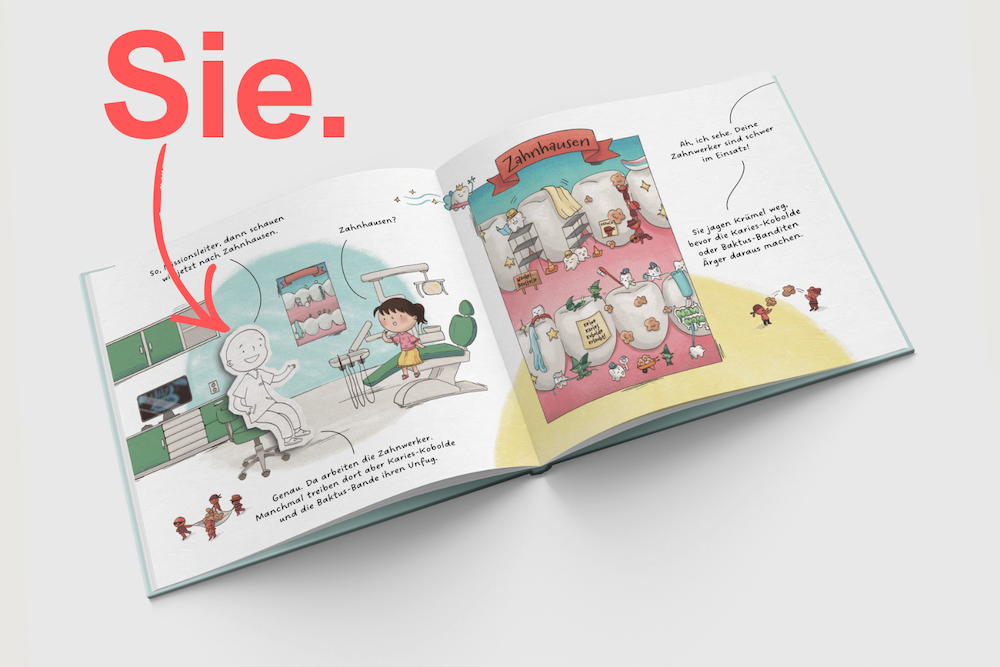 Für die Personalisierung benötigen wir außerdem Ihren Namen, den Namen Ihrer Praxis, das Praxislogo und ein Foto von Ihnen (diese erscheinen später in Ihrem Buch). Anhand des Fotos gestalten wir von Hand Ihren Charakter für das Buch.